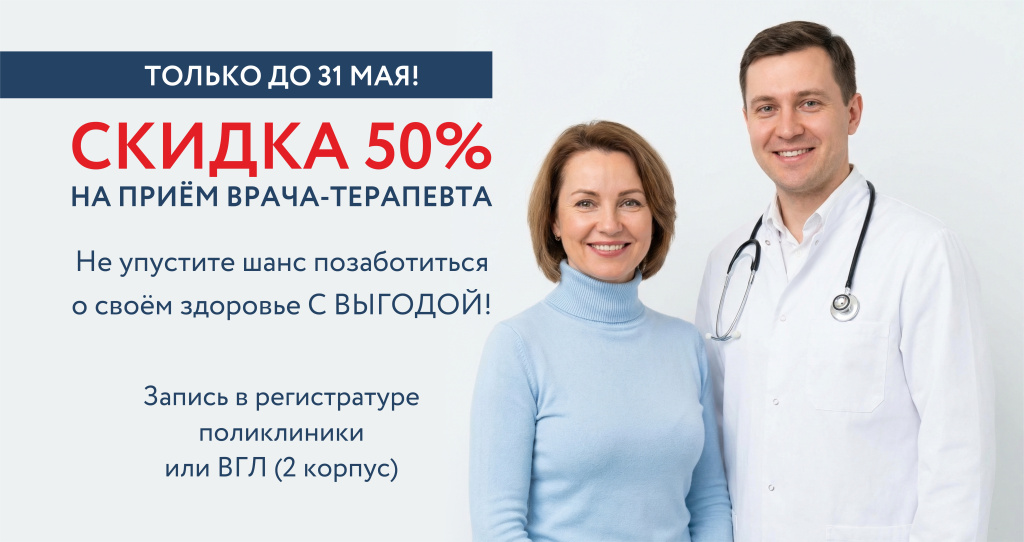 Успейте до 31 мая: приём врача-терапевта со скидкой 50%!